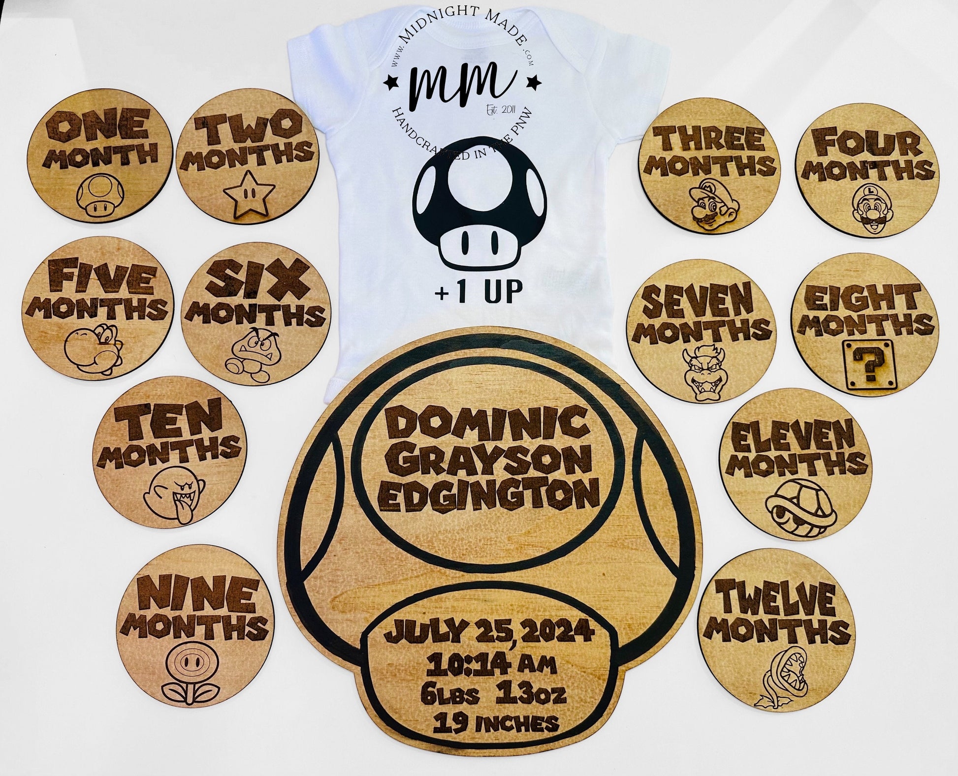 -Mario Brothers Monthly Milestones (12 pieces) Each circle is 4 inches wide and engraved.