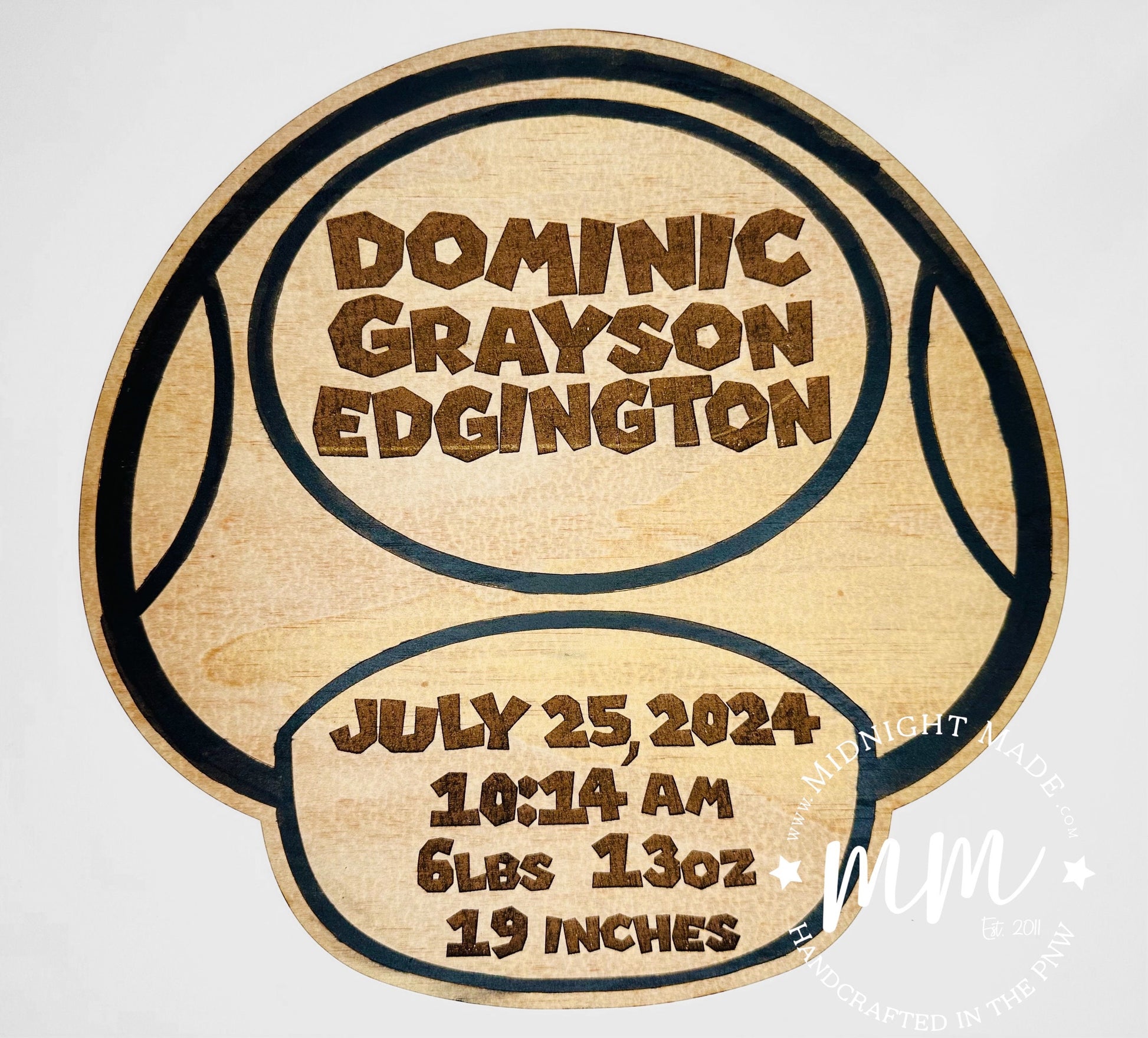 -Mushroom shape Baby Name and Stat Sign. The mushroom is approximately 12 inches tall by 12 inches wide and engraved with the inform that you include.
