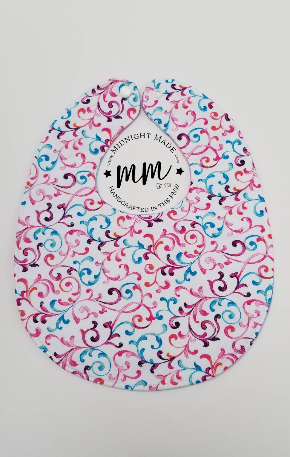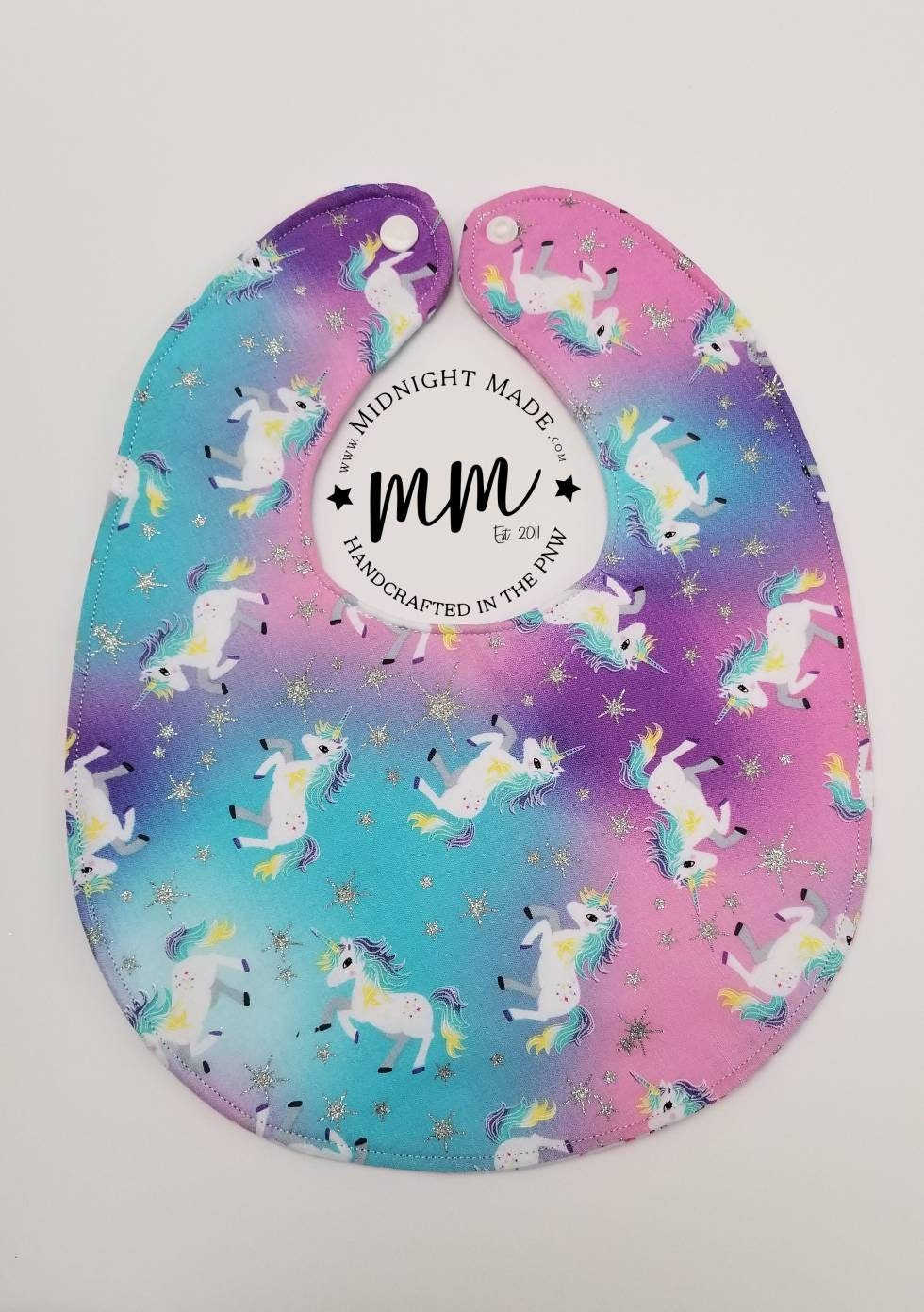 This listing is for ONE baby bib. You choose regular bib, bib bandana or both. The bib is reversible and double sided. One side is shimmer unicorn cotton and the other side is rainbow swirl cotton. This bib has a snap closure.