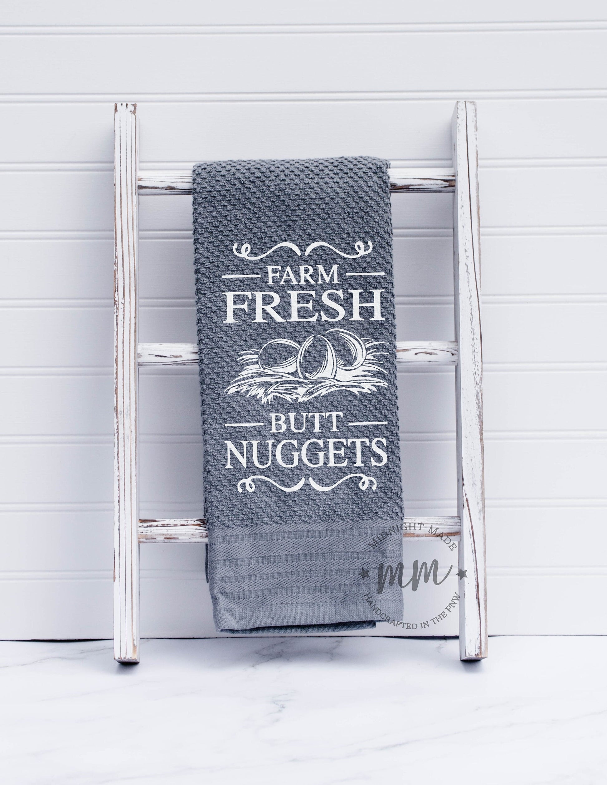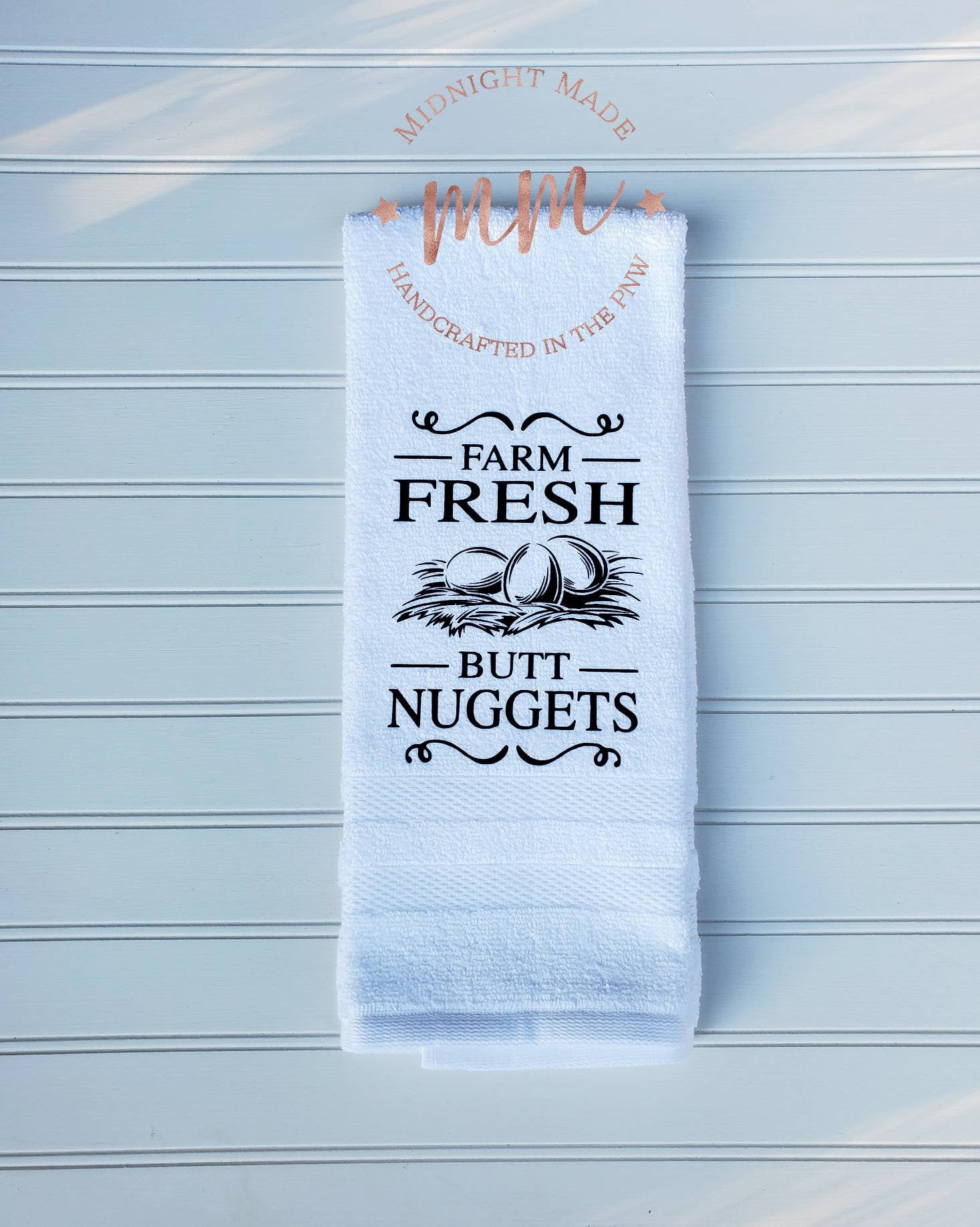 Farm fresh butt nuggets, chicken egg towel gift, kitchen funny towel, novelty towel farmhouse towel, chicken decor towel Midnight Made