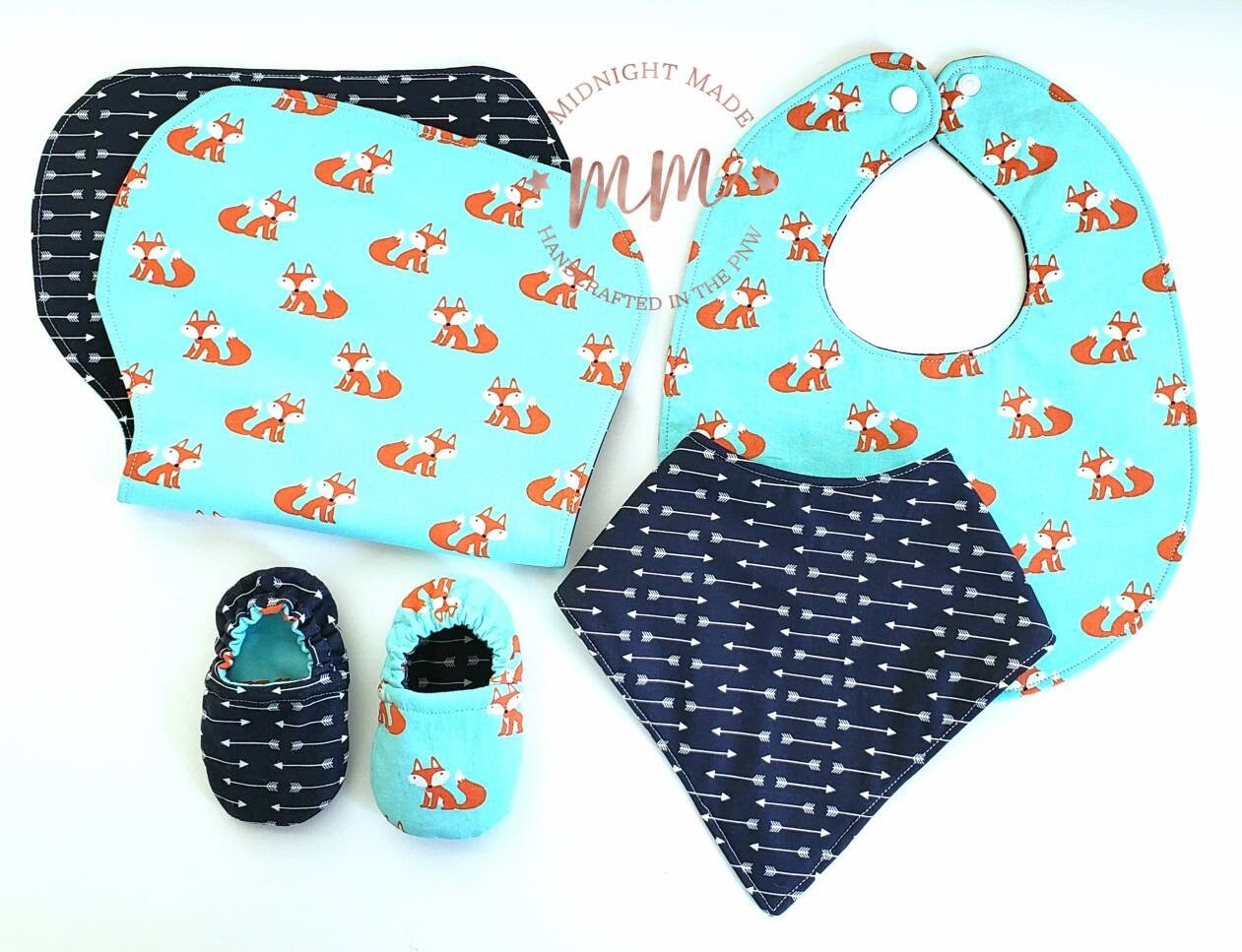 Fox and arrow waterproof reversible baby set, baby bib, bib bandana, burp cloth, baby shoes baby mocs, toddler children's Bib. Midnight Made