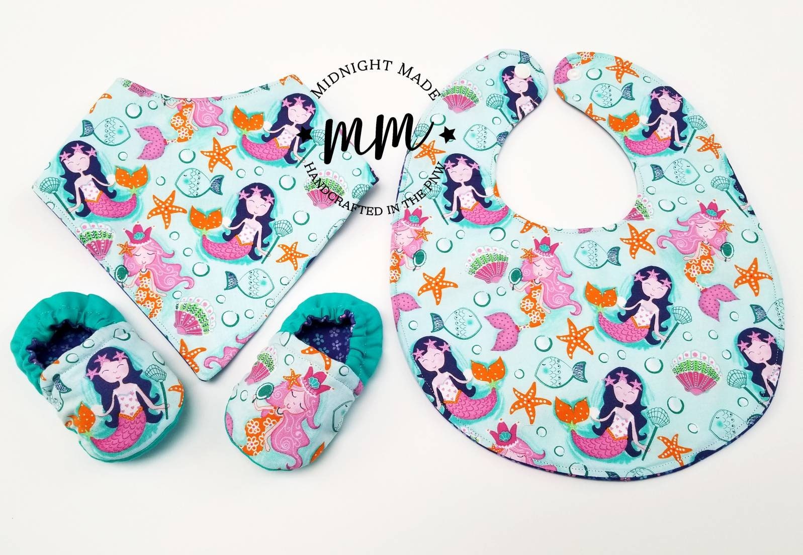 Mermaid and purple flowers Reversible baby set, baby bib, bib bandana, baby shoes baby mocs, toddler children's Bib. Midnight Made
