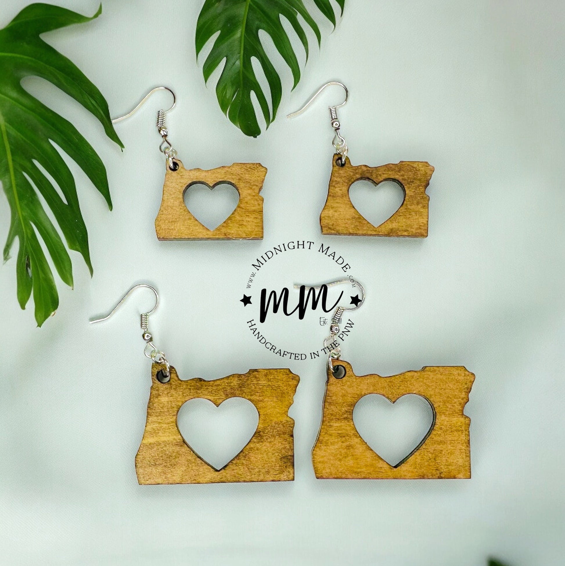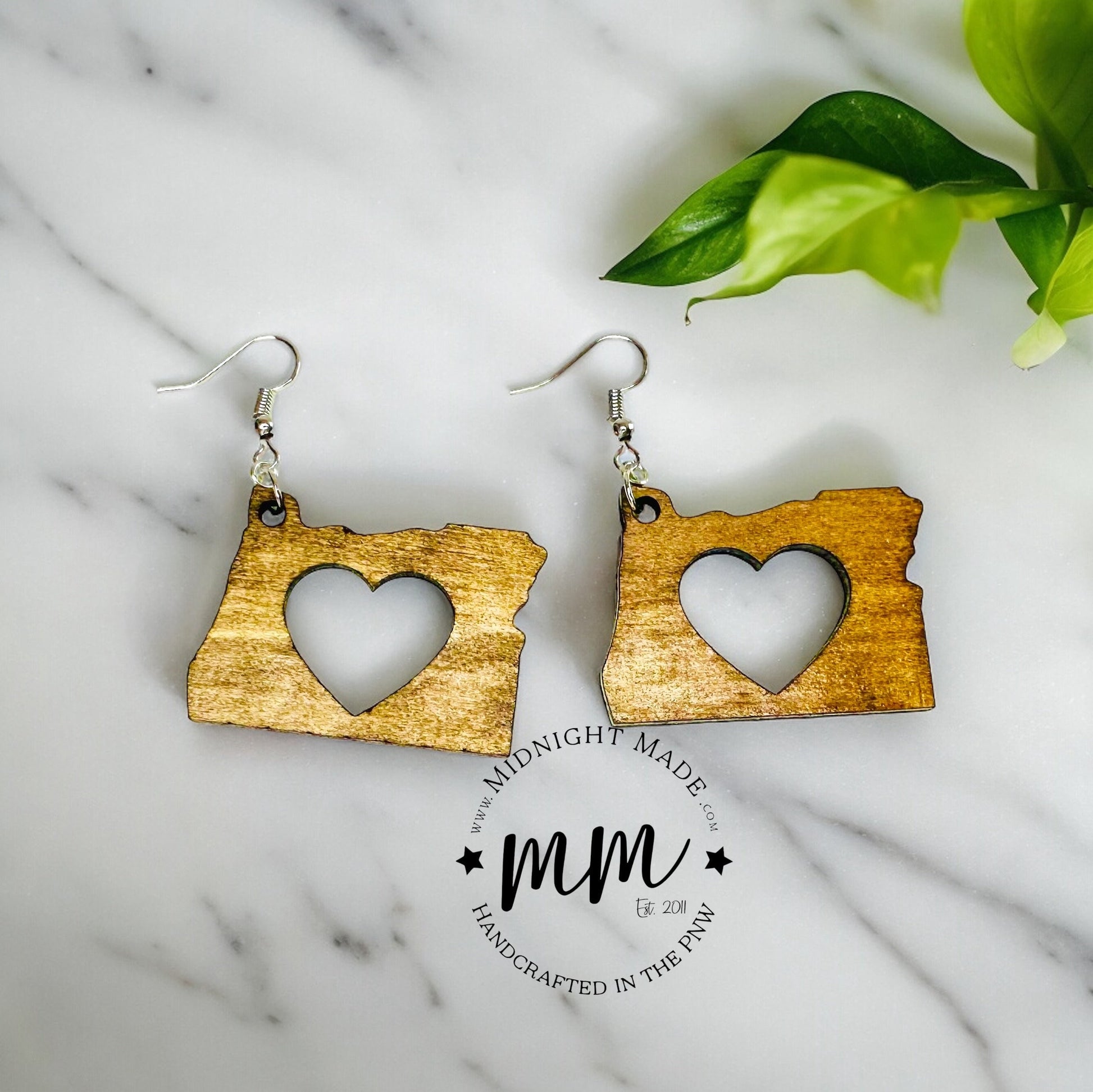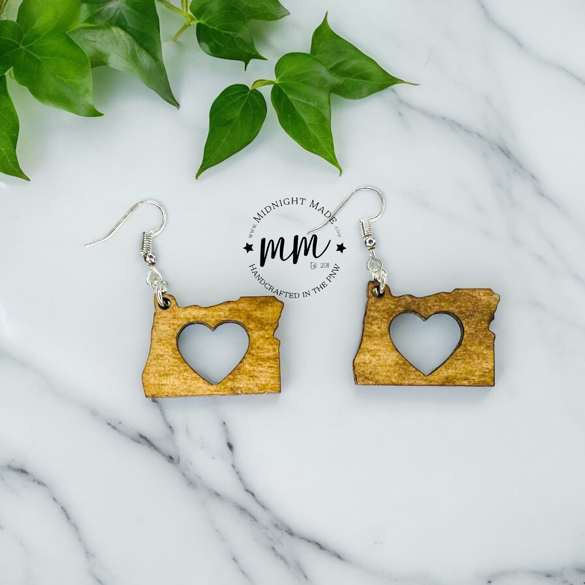 Oregon State Shape wood earrings Midnight Made, handmade light weight Portland, OR earrings with heart cutout