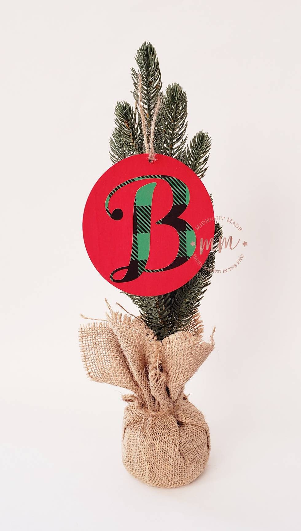 This listing is for one round red ornament (approximately 4 inches) with green buffalo plaid letter.