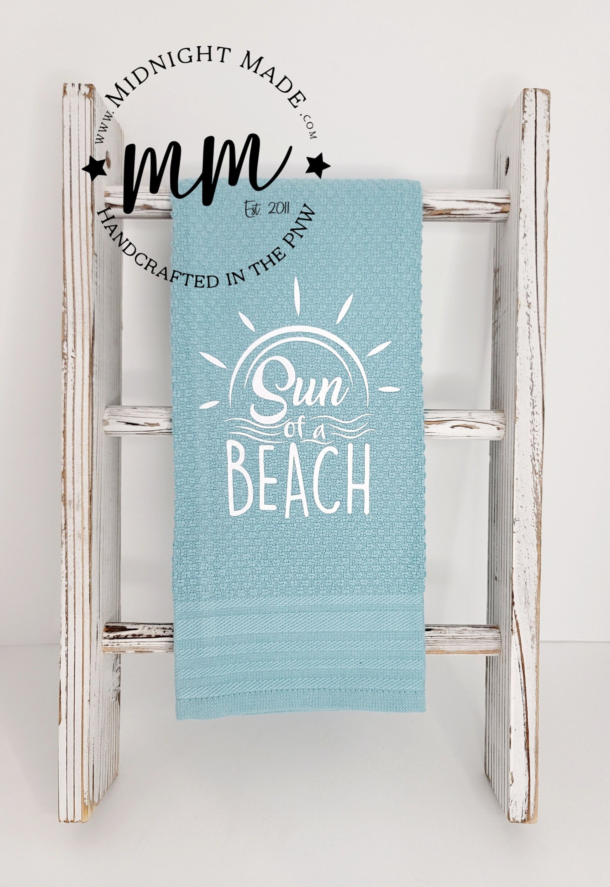 This listing is for ONE kitchen towel with "Sun of a Beach" in white print on a teal kitchen towel.