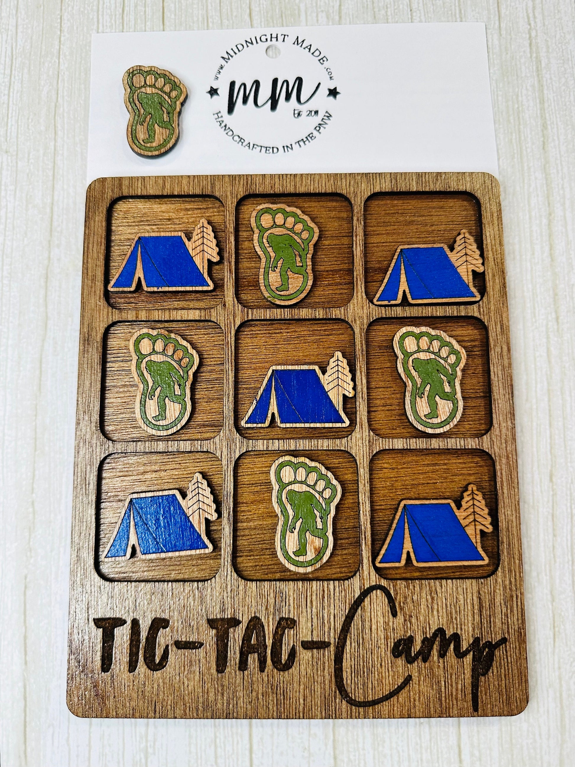 Each set includes the wood Tic Tac Camp game board (6x7 inches) with 5 wood Tent game pieces and 5 wood Bigfoot game pieces.
