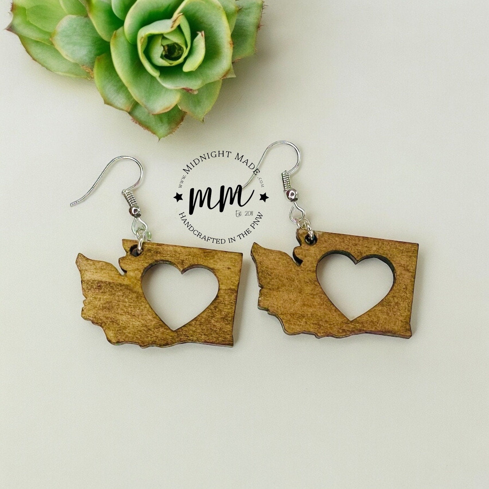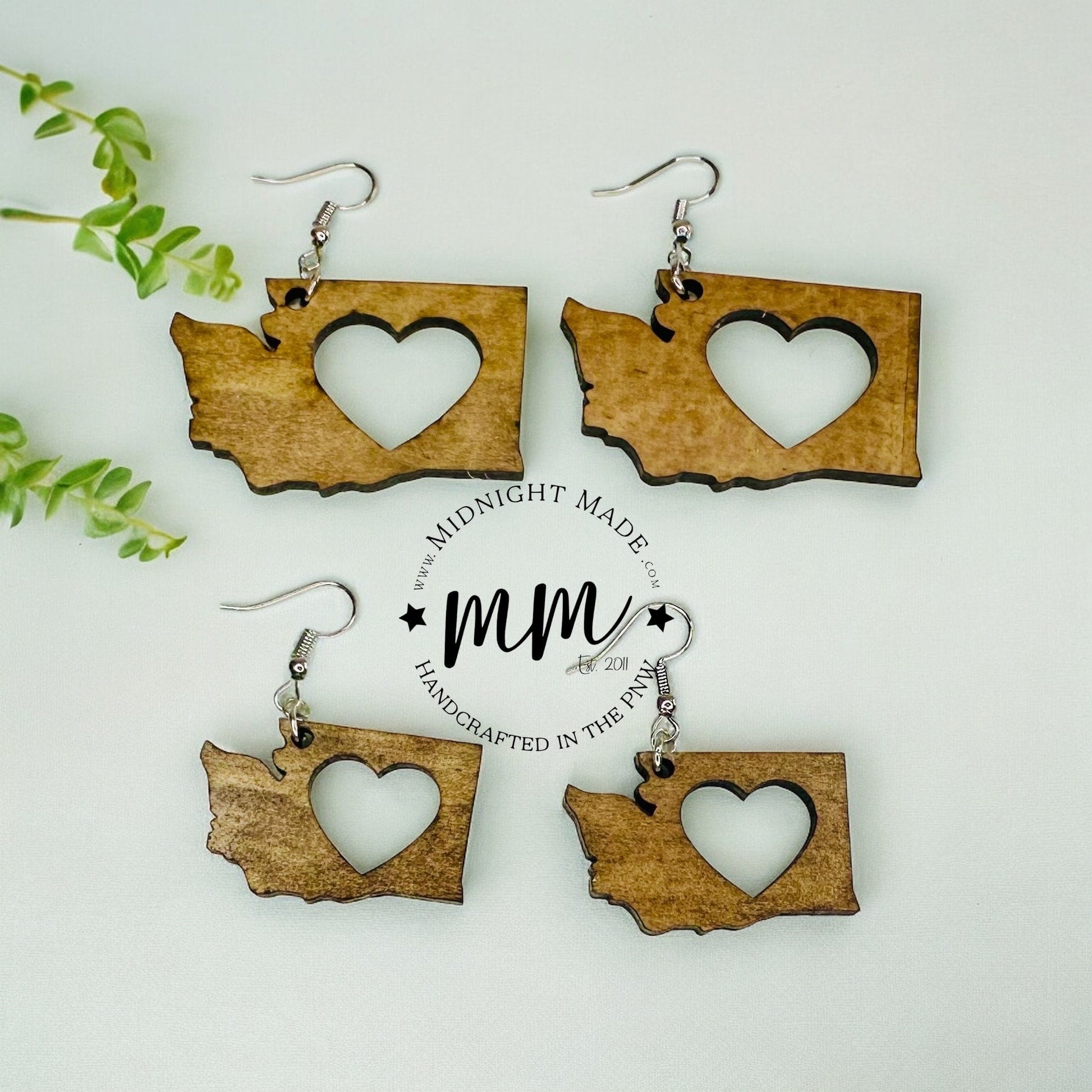 Washington State Shape wood earrings Midnight Made, handmade light weight Seattle, WA earrings with heart cutout