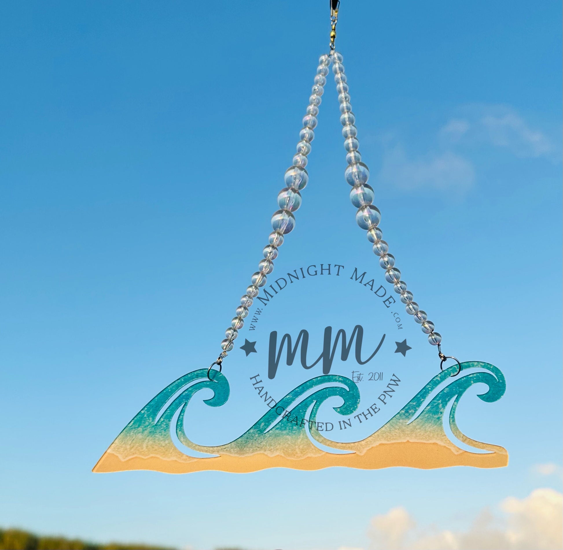 Wave Suncatcher, Sand and wave wall hanging window spinning mandala iridescent rainbow decor